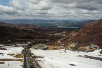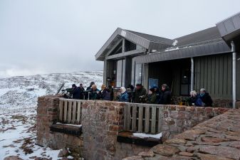 Some might say we’d left the best for last, it was time to go up the Cairngorm, UK’s sixth highest mountain. We took the funicular up to the end stop where most of us went out on the cafe terrace, scanning the hillsides below for the target birds of Ptarmigan, Dotterel and Snow Bunting. Some eagle-eyed person, Sean, managed to stop a white dot in the far distance that was identified as a Dottrel. Back down again we spotted a male Ring Ouzel is singing by the funicular building.